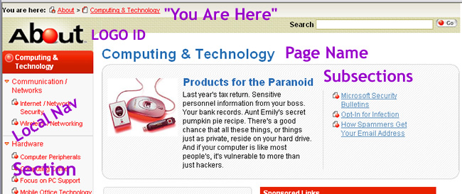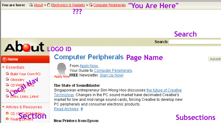 About.com is a huge site. The use of breadcrumb helps the user to know where they are at. Breadcrumb application here is defined but there is an error. When I clicked on Computing Technology from the main site it brought me to Figure 1. When computer peripherals was selected, the breadcrumb information was incorrect. See figure 2. About>Electronic And Gadgets>Computer Peripherals